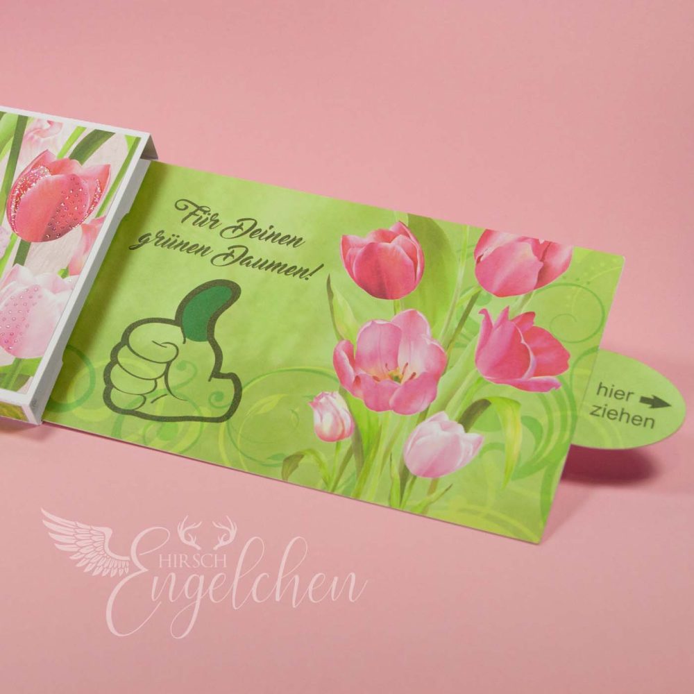 Und weiter geht’s mit jeder Menge Tulpen zum Geburtstag und einem Gutschein mit einem grünen Daumen…
